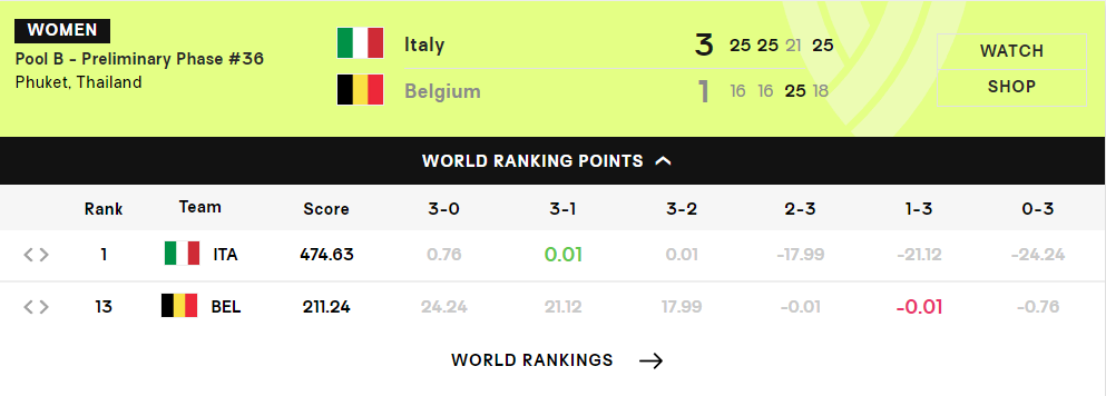 意大利女排是目前的世界第一,比利时女排是世界第13,所以这场比赛意大利女排3-1击败比利时也只增加0.01分而已,这两支球队的硬实力差距很明显,但此役意大利女排强力接应埃格努的战意很浓厚。